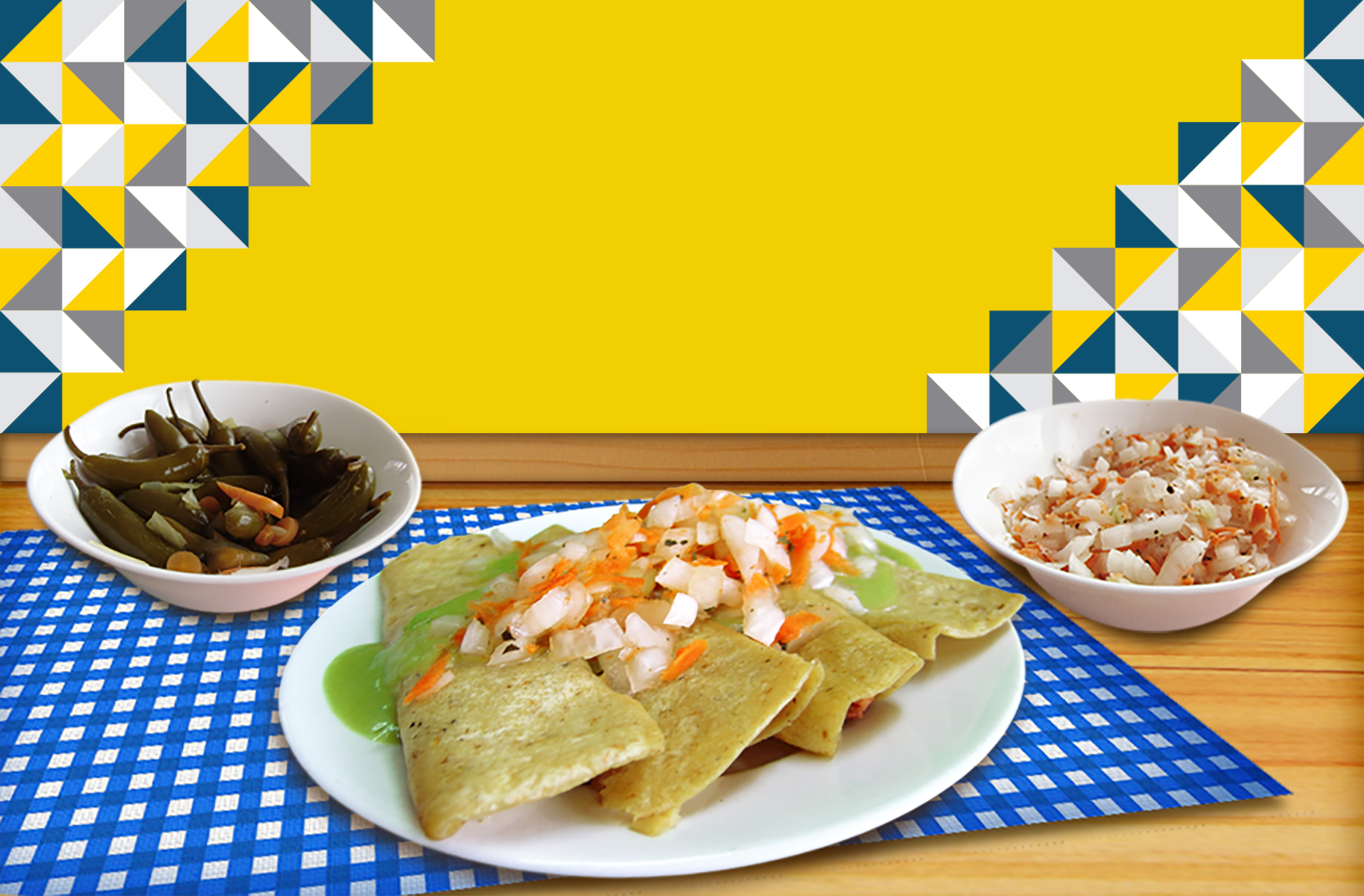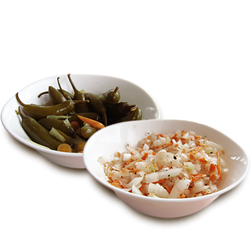 Salsa verde, salsa roja, ensalada, chiles en vinagre, platos, servilletas, tenedores, palillos, sobres de sal y mentas.